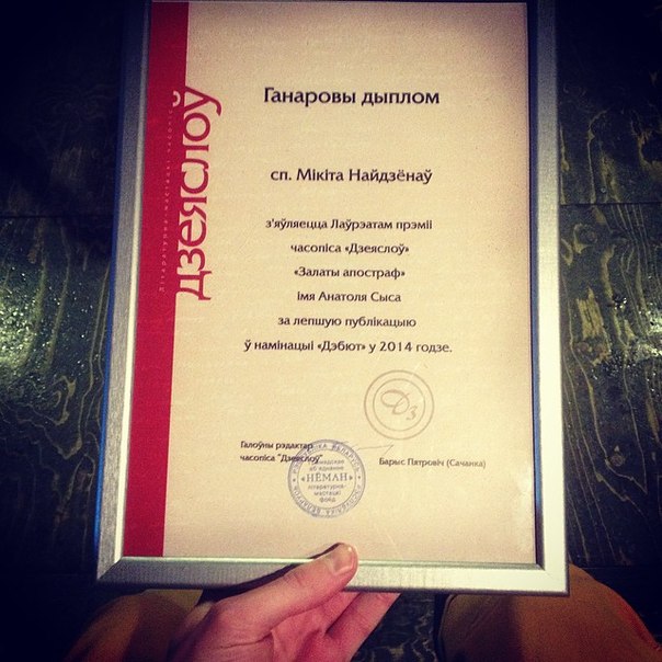 Мікіта Найдзёнаў, пераможца ў намінацыі «Дэбют»: «Больш за ўсё ў мяне стаіць пытанне на тэму кахання. Гэтым я натхняюся. Я пішу не для прэміі, а таму, што пішацца. І, безумоўна, мне прыемна, што мае вершы ўбачаць тыя людзі, на вершах якіх я сам рос. Мне было б вельмі цікава, каб тыя паэты, якіх я сам чытаў, яны таксама заўважылі мяне, прычым не як зялёнага пачаткоўцу, а паставіліся да мяне як да новай плыні ў беларускай літаратуры. Я вершы пішу не першы год, я перамагаў не на адным літаратурным спаборніцтве. Але гэта не галоўнае. Галоўнае — тое, што нехта чытае твае вершы, ты сваімі вершамі трапляеш у кагосьці. Калі ты пішаш — гэта праўда — ты не можаш не пісаць. Не дзеля «краснага слаўца» або для Сяргея Дубаўца, а ты пішаш таму, што табе ёсць што сказаць».
