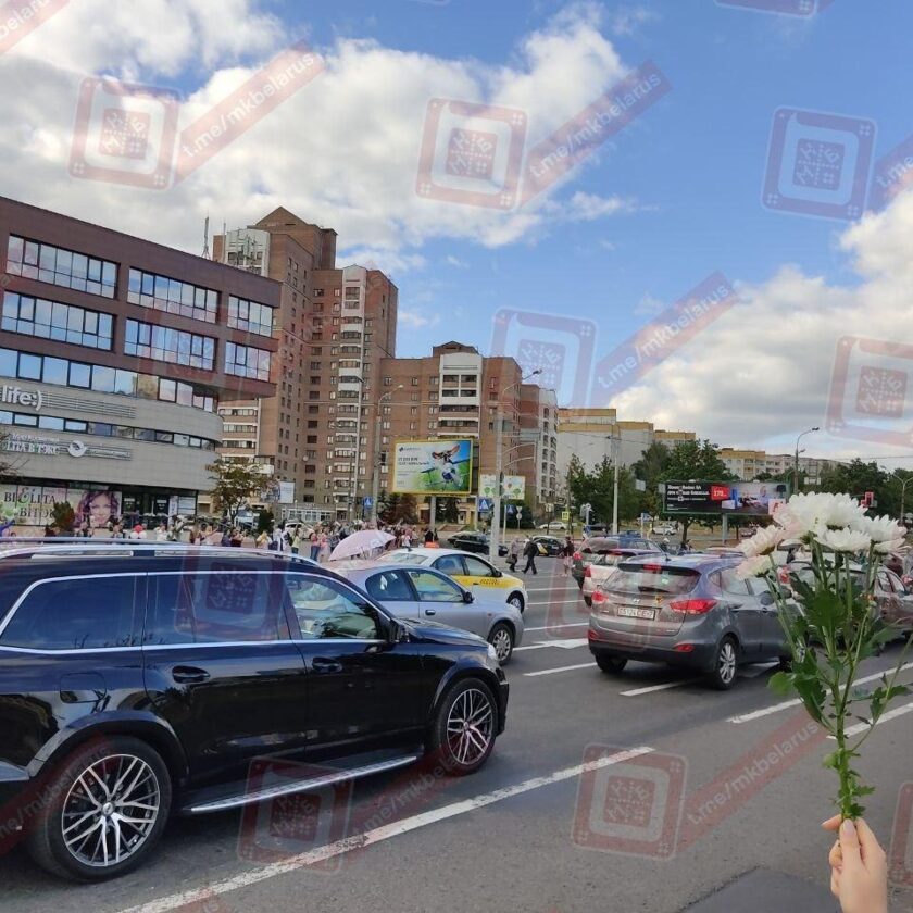 Минск. На проспекте Независимости рядом с площадью Якуба Коласа остановилось движение, люди вышли на дорогу. Кто-то кричит «Выходите, мы победили».
