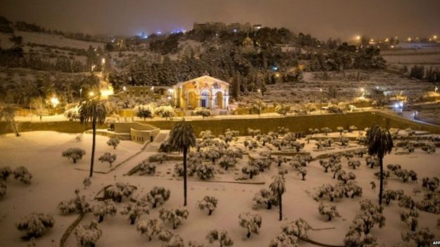 Снег покрыл пустынную местность в окрестностях Иерусалима, а знаменитая церковь Рождества в Вифлееме и Стена плача в Иерусалиме сверкали на морозе.