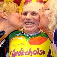 Французский велосипедист установивший рекорд в возрастной категории «Старше 100 лет», отметил шампанским свой 103-й день рождения преодолев 10-километровый подъем на гору названную в честь его.