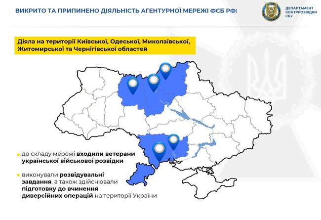 Контрразведчики СБУ разоблачили и пресекли деятельность агентурной сети ФСБ РФ, действовавшей на территории Киевской, Одесской, Николаевской, Житомирской и Черниговской областей.