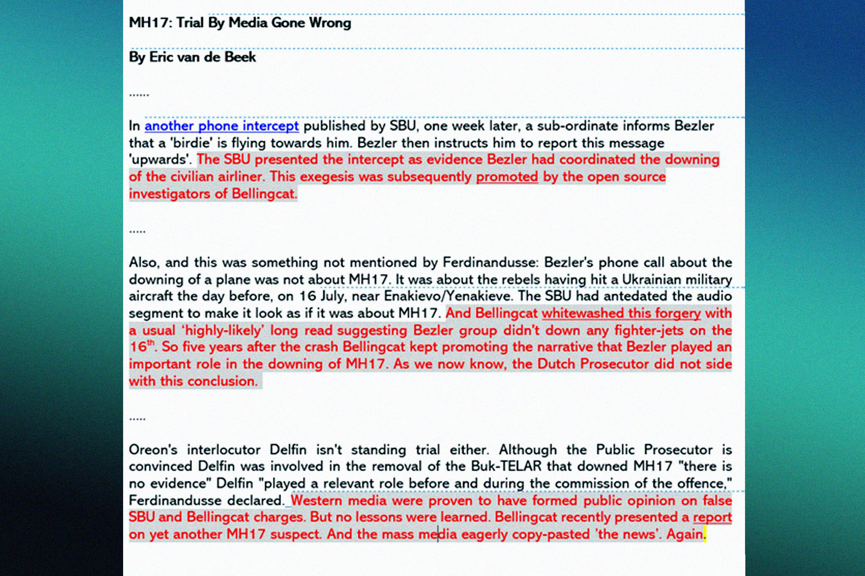 Опубликованная версия статьи ван де Бека уже отличалась от копии, отправленной Ерлашовой офицеру ГРУ, двумя существенными изменениями. Обе эти правки усиливали критику в адрес Bellingcat.