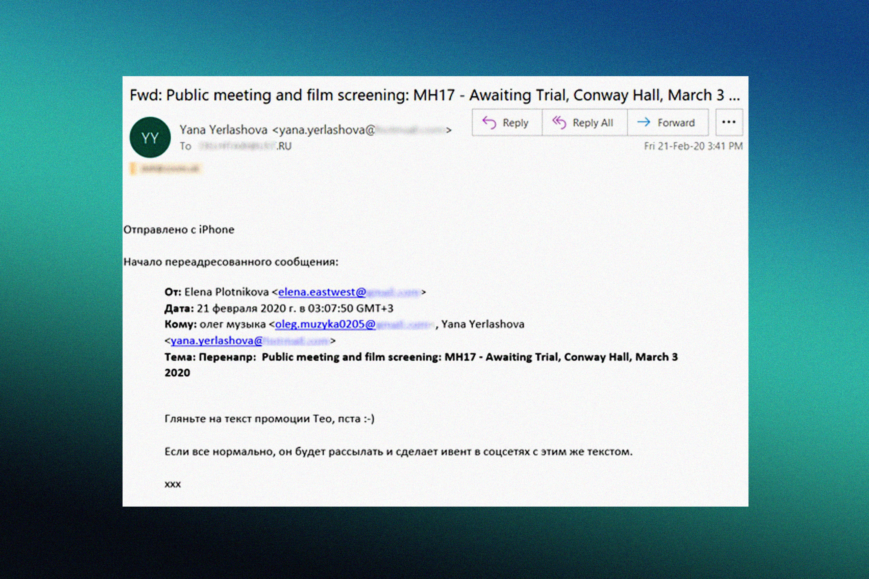 Ему присылали еще неопубликованные черновики статей, предназначенные для публикации на веб-сайте Bonanza Media, а также черновики рекламных материалов для мероприятий с участием Bonanza. В электронном письме от 21 февраля 2020 года Яна Ерлашова направила полковнику Чебанову черновик тизера документального фильма Bonanza, премьера которого была запланирована на 3 марта 2020 года в Лондоне. Тизер, подготовленный британцем Тео Расселом, изначально был отправлен на одобрение помощнице Ерлашовой по СМИ по имени Елена Плотникова. Плотникова — активная сторонница Кремля из Нидерландов и член непрозрачно финансируемой организации под названием «Глобальные права для мирных людей», основная миссия которой, по словам самой организации, состоит в защите боевиков на востоке Украины. Через полчаса после того, как Ерлашова получила предложенный рекламный текст, она отправила его — видимо, для утверждения — полковнику ГРУ Чебанову.
