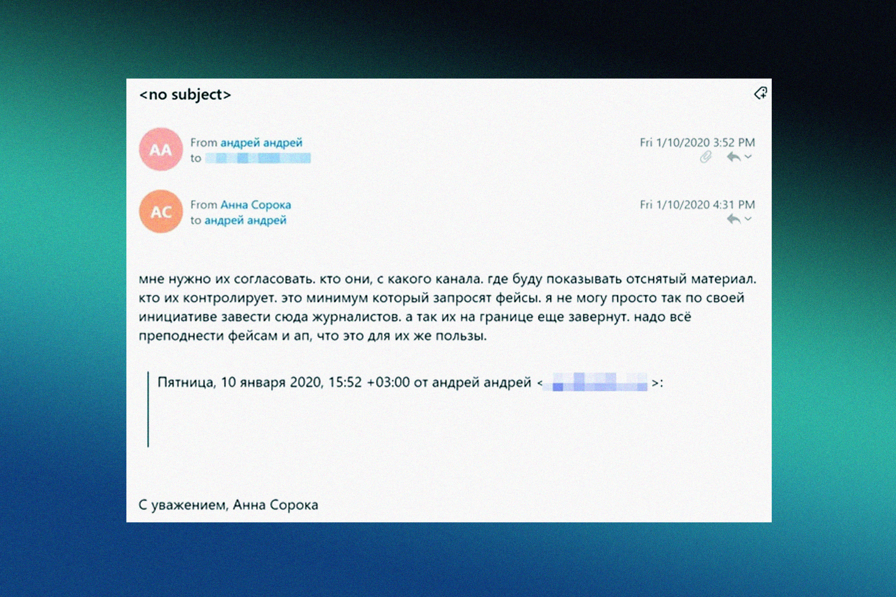 Зачем Ильченко звонил в «ЛНР» и отсылал сканы паспортов, становится понятным из ответа, полученного им от Анны Сороки позже в тот же день. В 16:32 она ответила ему по электронной почте, что визит надо согласовать с «фейсами и АП».