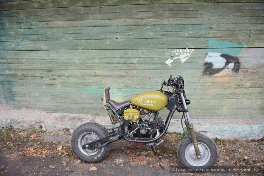 Самый ценный, в память о прадедушке, и главный по старшинству – двухколёсный «кузнечик». Свой первый облик этот обычный китайский мопед ХТ 55-18, попав в руки Дениса, приобрёл года 3 назад. С тех пор стальной конь пережил несколько перевоплощений и в конечном варианте получил от автора новое гордое имя – Грассхоппер, или кузнечик.