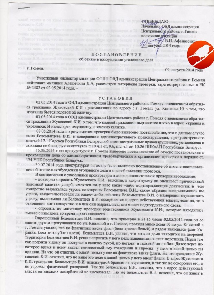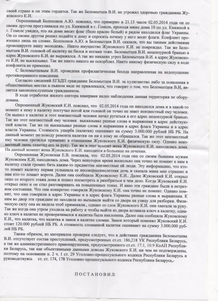 Нарэшце прыйшлі міліцыянты, павіталіся за руку са злачынцам. Пасля недоўгай размовы з міліцыянтамі нападнік пачаў некаму тэлефанаваць, пры гэтым брудна лаяўся, але міліцыянты не рэагавалі ні на што, нягледзячы на мае патрабаванні прыняць меры да парушальнікаў закону, затрымаць іх за парушэнне грамадскага парадку і пачаць следчыя дзеянні. Потым міліцыянты паведамілі мне, што паедзем усе разам у аддзел для разбіральніцтва, а на маё патрабаваньне зняць адбіткі ботаў з брамкі, апісаць адзенне і абутак злачынца, каб было прасцей даказаць віну нападнікаў – міліцыянт (старэйшы па званню) паведаміў: “идите домой и не провоцируйте — участковый придет к вам сегодня и опросит».