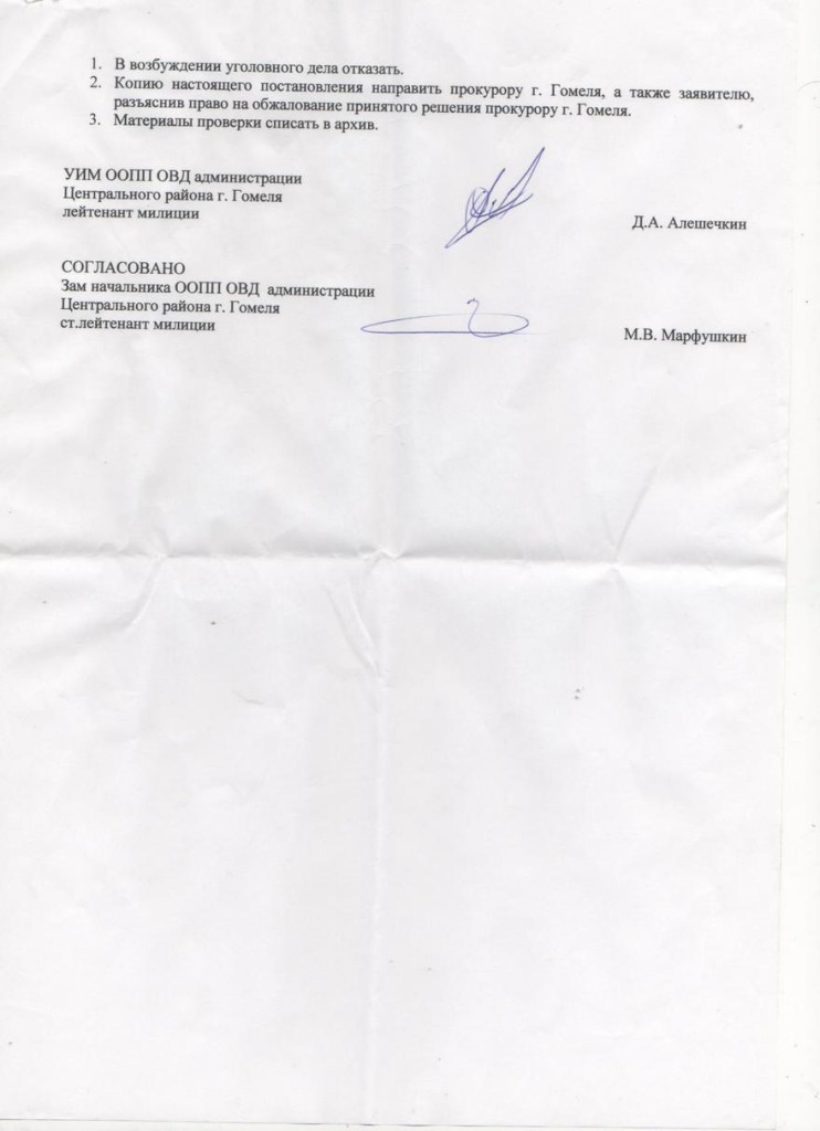 Ні ўвечары ні заўтра да нас ніхто не прыйшоў, і толькі пасля неаднаразовага тэлефанавання, прыйшоў участковы, узяў тлумачэнне і ўжо 3 месяцы мне дасылаюць ліпавыя адказы і адмовы як з МУС, так і пракуратуры.