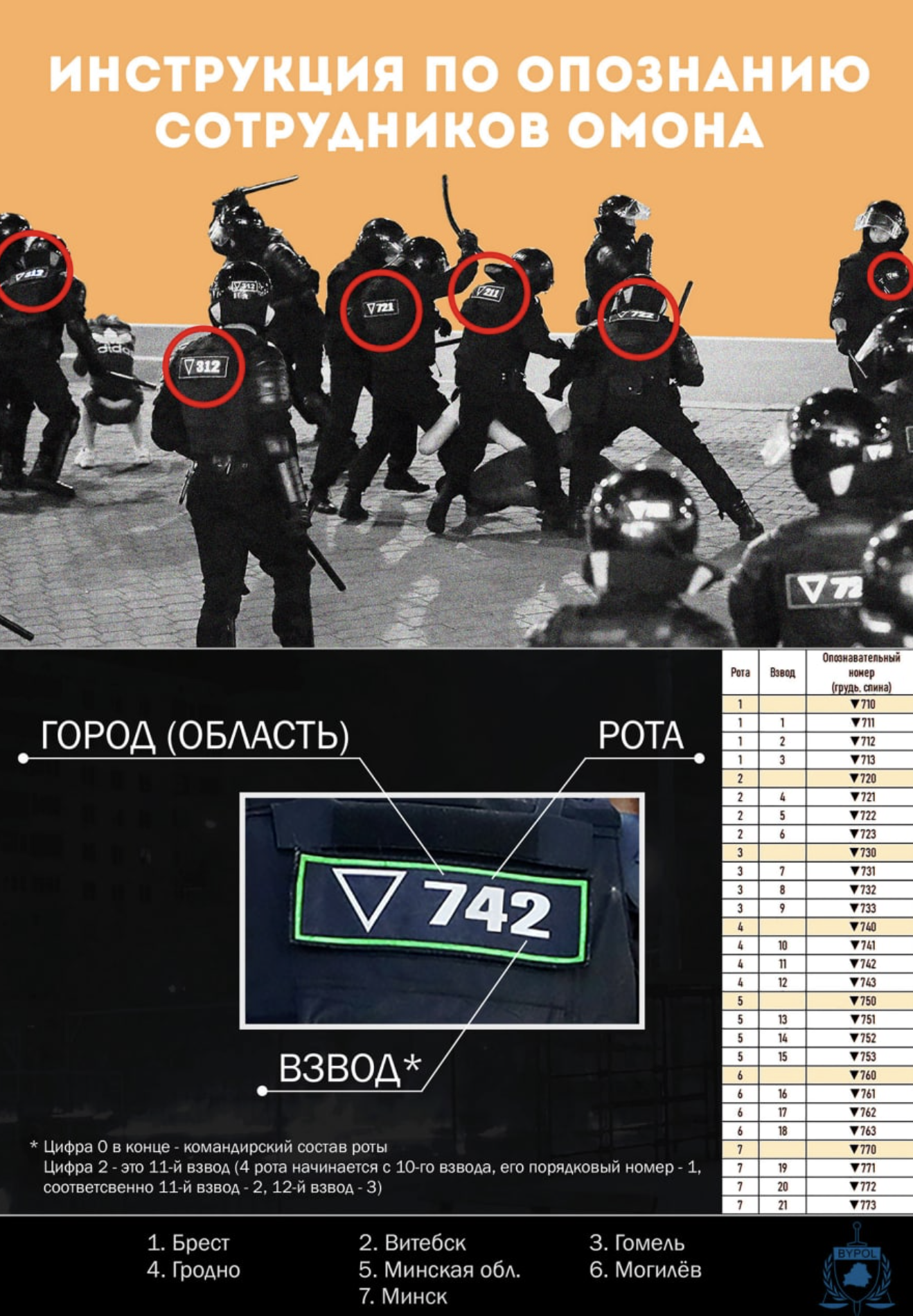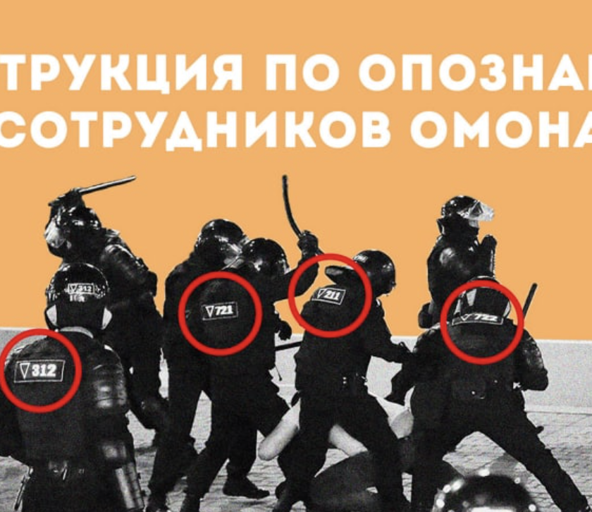Основную роль в силовых разгонах акций протеста в Беларуси играет ОМОН. В сети Интернет имеется множество фотографий сотрудников небезызвестного подразделения во время совершения ими преступлений, имеются свидетельства о их переброске из одного города в другой. Практически каждая единица имеет опознавательный знак подразделения.