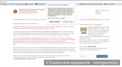 По данным управления по раскрытию преступлений в сфере высоких технологий, мошенники используют вредоносные вирусные программы. Потенциальные жертвы получают сообщение якобы от МВД Республики Беларусь, в котором предлагается уплатить штраф за просмотр и копирование материалов, содержащих элементы педофилии, насилия и гей-порно. Далее приводится информация о том, что в течение суток после уплаты штрафа «нарушитель» получит код разблокировки своего браузера. Сумма «штрафа» — 1 млн. белорусских рублей. Только за последние десять дней на предлагаемый преступниками электронный кошелек переведено порядка 40 млн.