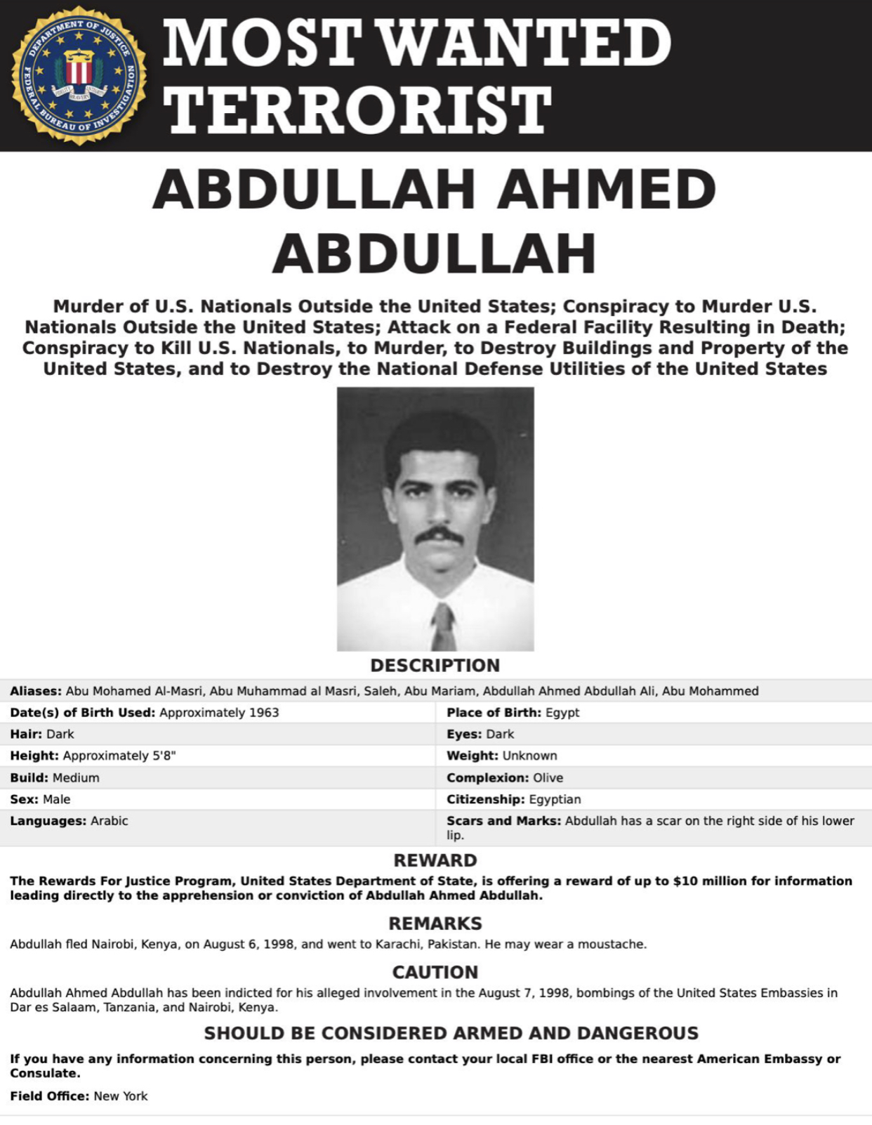 Аль-Масри родился на севере Египта в 1963 году и, как сообщает издание, в молодости был профессиональным футболистом. После советского вторжения в Афганистан уехал в эту страну и присоединился к моджахедам, воевавшим против СССР и его союзников. После войны египетские власти отказали аль-Масри в праве на возвращение и он остался в Афганистане, где познакомился с Осамой бин Ладеном. Вскоре он стал руководителем африканского отделения «Аль-Каеды» и организовал атаки на американские посольства в Кении и в Танзании 7 августа 1998 года. В результате этих террористических актов 224 мирных жителя погибли (среди них 12 американцев) и еще примерно пять тысяч получили ранения. За день до этого аль-Масри покинул Африку и вернулся в Афганистан. Он попал в американский список самых разыскиваемых преступников в мире. Американские власти пообещали заплатить 10 миллионов долларов за информацию об аль-Масри.