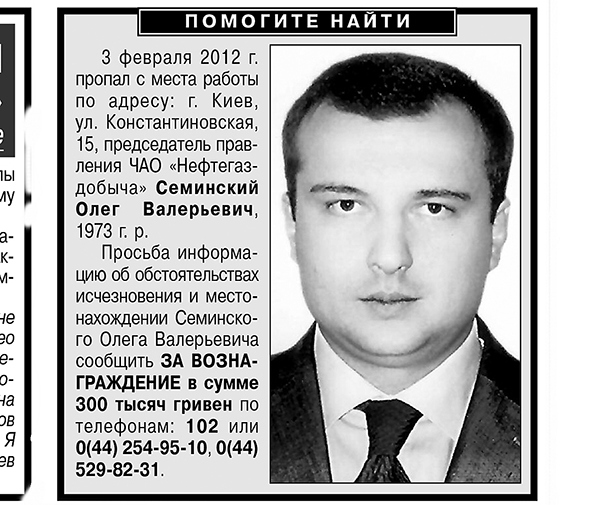 О.С.: Между нами всеми. В последнее время я чувствовал неадекватность Рудковского. Шуфрич, как второй мажоритарный партнер, был более адекватен. Этим конфликтом и воспользовалась третья сторона. И вот, 3 февраля 2012 года меня похищают с целью убийства. Так как «брали» меня, Альфа СБУ просто отдыхают. Это была очень серьезная, четко спланированная до мелочей бандитами, спецоперация. Кстати, она должна была осуществиться на несколько месяцев ранее. После моего исчезновения возникает очень серьезный конфликт между Шуфричем и Рудковским. В процессе выяснения отношений между ними один утверждал одно, второй — другое, а третий, Семинский, отсутствовал, пребывая в статусе «пропавшего без вести». Наблюдая за этим конфликтом, бывший министр энергетики и угольной промышленности Ставицкий, приостановил действие лицензий ЧАО «Нефтегаздобыча» и предъявил претензию на 30% доли компании в пользу семьи Януковича. —