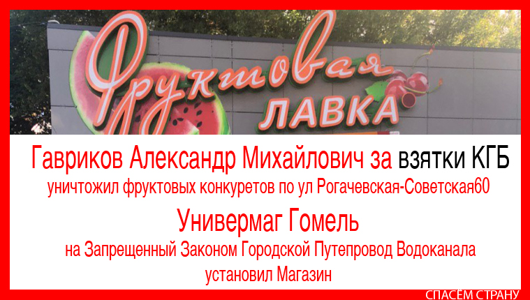 После наш фальшивый активист Гавриков получает от главного Архитектора Гомеля Елены Лукьяненко (разговор с Лукьяненко записан и имеется в подтверждении ) по просьбе Ардабьева Александра Олеговича, разрешительные документы на реконструкцию и снос павильона, переквалифицировав его в магазин со входом ,увеличение квадратные метры и Нового соответственно места в 5 метрах от старого, Так-же наши маскировщики Меняют и название — вместо ТРОПИЧЕСКИЙ РАЙ на ФРУКТОВАЯ ЛАВКА, новым названием перечеркивают старые проблемы и все начинается с начала, спокойная жизнь на костях уничтоженных семей, все там же на Универмаге города Гомель.