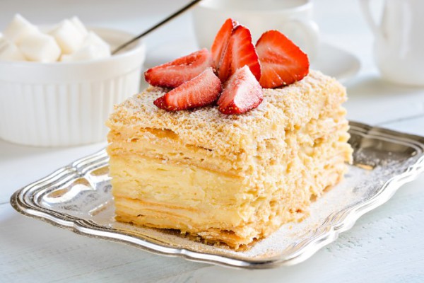 Торт Наполеон готовится из слоёного теста с кремовой прослойкой. Рецепт торта Наполеон известен с 1850 года. И с тех пор является одним из самых любимых лакомств на земле! У каждой хозяйки, в каждой семье есть свой фирменный рецепт торта Наполеон, Бабушка Эмма, с удовольствием, делится своим любимым рецептом торта Наполеон.