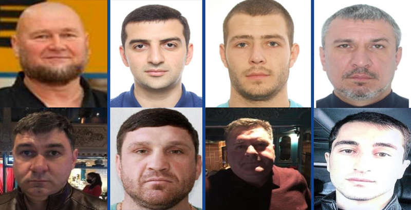 Задержанные по делу о вымогательстве слева направо: верхний ряд — Олег Чепенко, Карлос Карапетян, Владимир Быков, Сергей Жмуденко, нижний ряд — Сергей Литвинчук, Эдуард Бойко, Юрий Соколов, Рамазан Мамчуев.