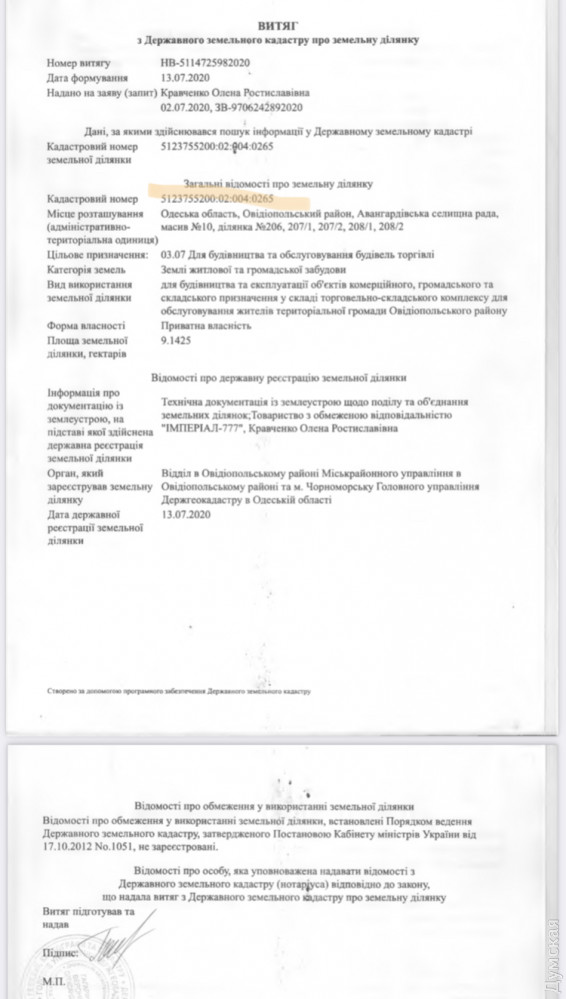 ОБНОВЛЕНО В 18:05. Как сообщили в компании Люстдорф Грінфілд, более 9 га земли находятся в их собственности, а участок застройки поделен на несколько зон — под застройку и озеленение с благоустройством. В связи с этим поменялись кадастровые номера.
