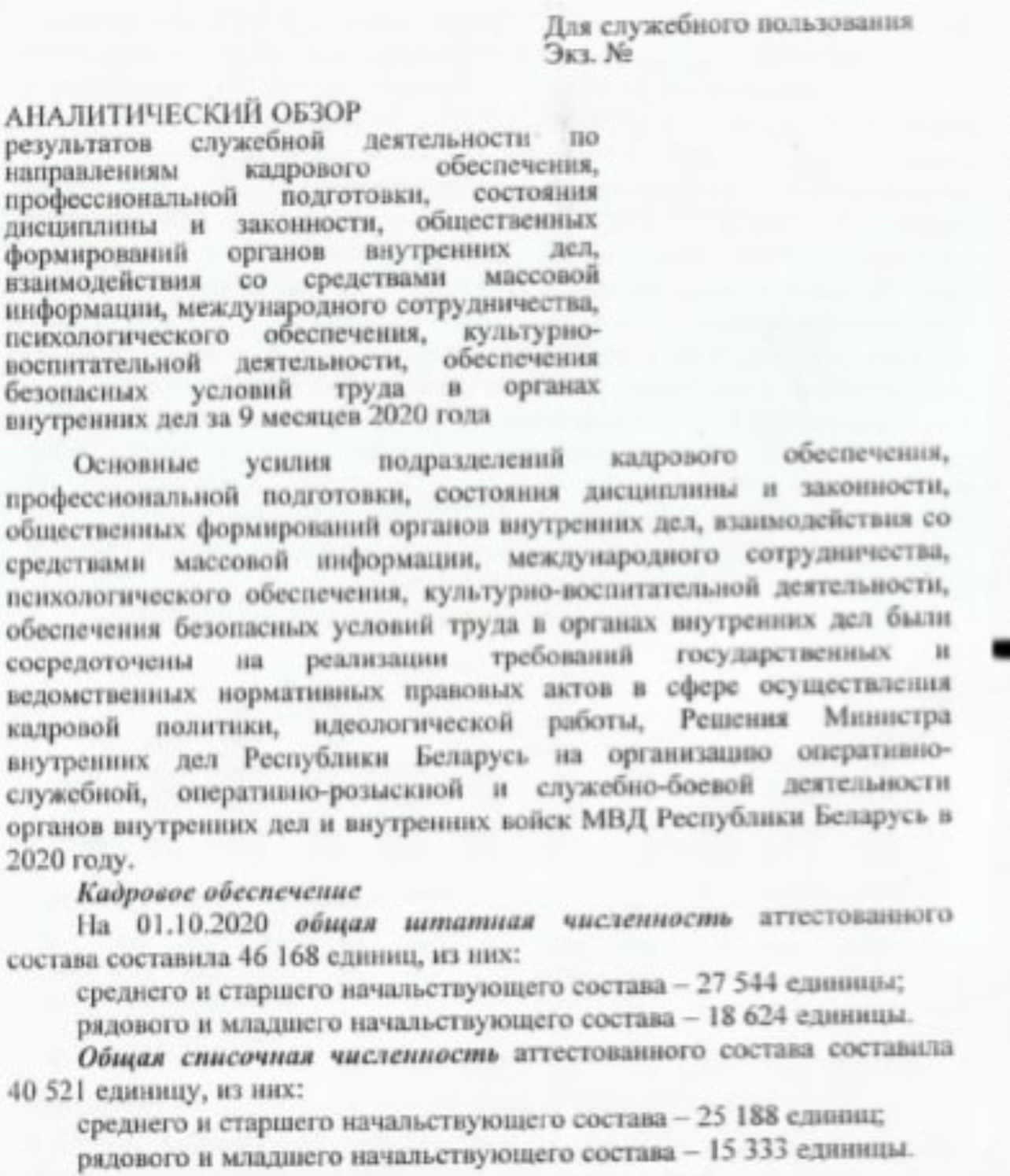 Данные показатели самые низкие за последние 10 лет, что свидетельствуют не о положительной динамике, как утверждается в документе, а о том, что в МВД с начала года был установлен негласный запрет на привлечение сотрудников к различным видам ответственности с целью сохранения кадрового ядра на фоне массовых увольнений сотрудников (в настоящее время данный запрет закреплён в распоряжении МВД Республики Беларусь от 18.08.2020 №6дсп «О стабилизации морально-психологического климата и сохранения кадрового ядра»).