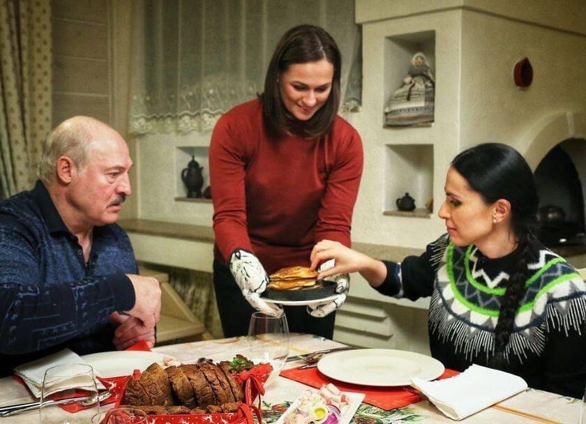 На фото проститутка Наталья Эйсмонт кормит Лукашенко и любовницу Костина Наилю Аскер-заде, предположительно, блинчиками.