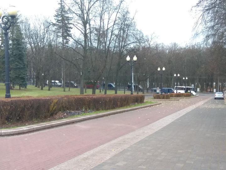 Та часть колонны, которая ушла в парк, стоит возле фонтана и кричит: «Жыве Беларусь!». Флаги пока не свернуты. После этого часть людей решила пойти к Оперному, остальные разошлись по дорожкам парка. Через оцепление их пропускают, машины сигналят в поддержку. За людьми к Оперному поехали и бусы с силовиками.