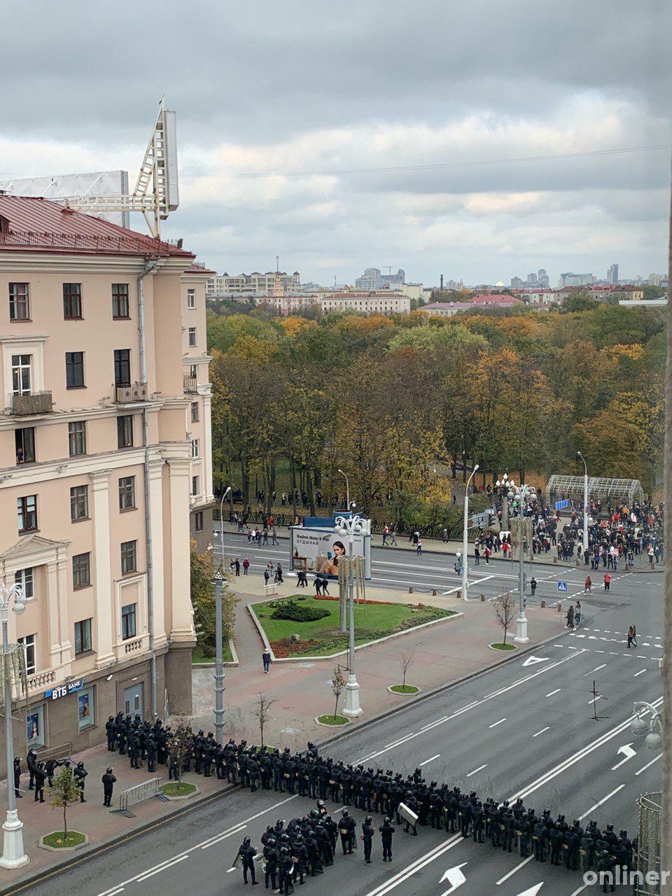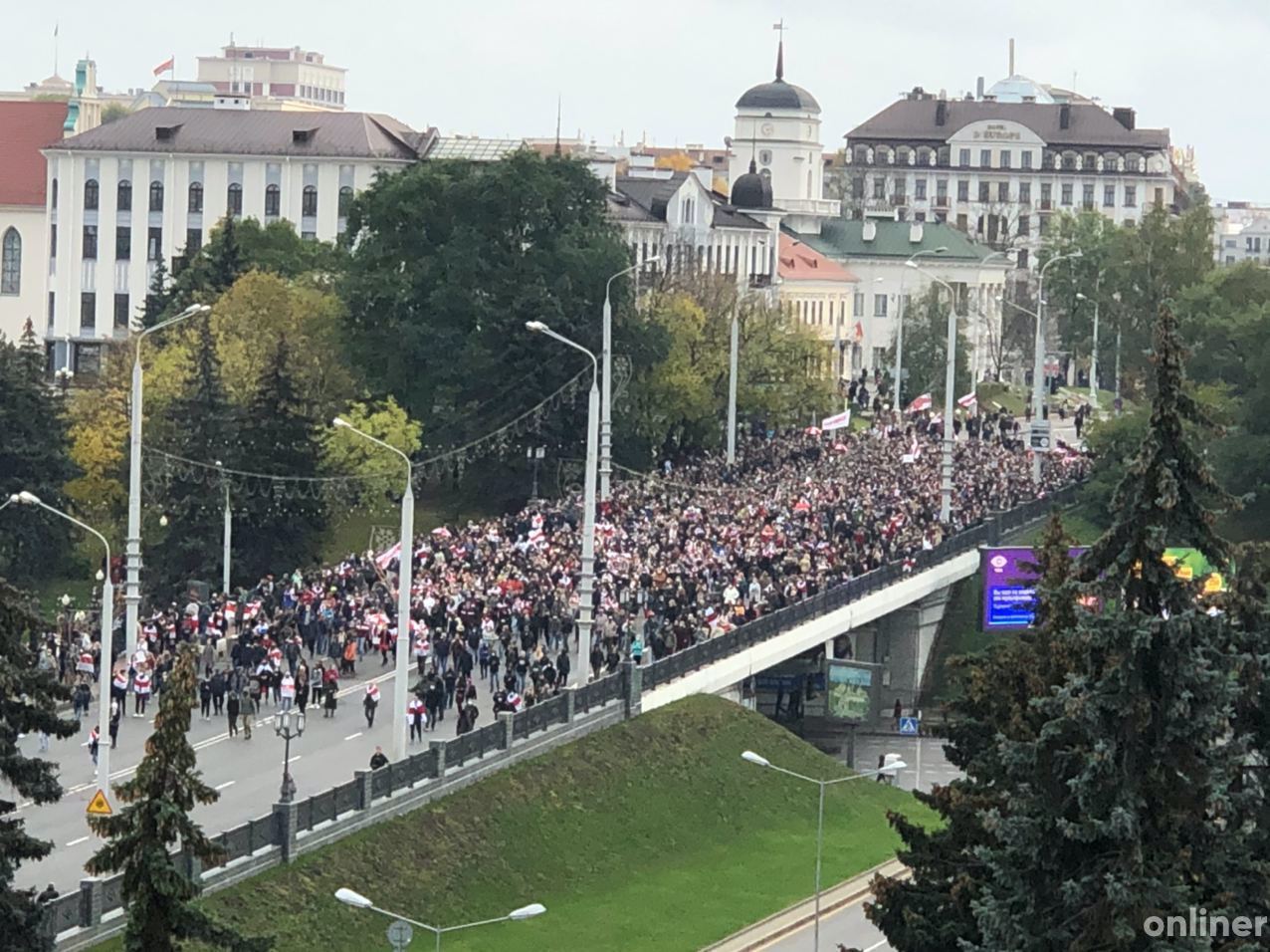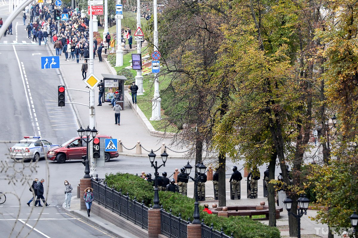 Минск. Многотысячная колонна демонстрантов сейчас у площади Победы. Они движутся в сторону центра. Неизвестные в шлемах и балаклавах перекрыли проспект Независимости в районе цирка.