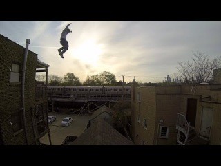 Прыжок с крыши где-то в Чикаго выглядит очень сложным, и, судя по видео, Свенсон волнуется и серьезно к нему готовится. Он перебинтовался, надел защитную каску, предварительно испытал крышу, на которую надо приземлиться, закрепил на ней камеру, рассчитал правильный разбег и даже отрегулировал дыхание. В общем, похоже, в итоге все удалось блестяще (были ли дубли и сколько штук — не угадать):