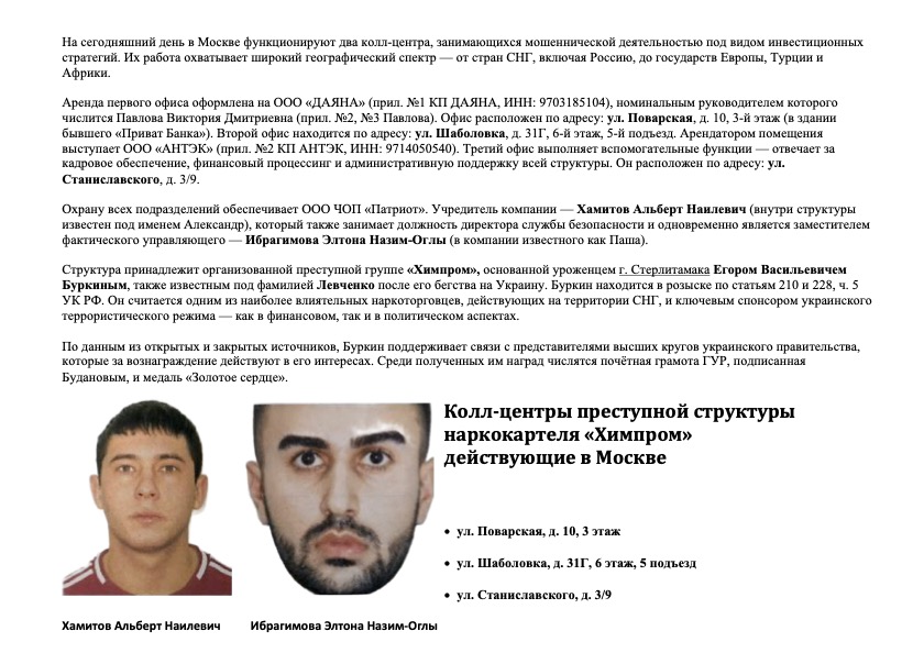 В Москве продолжают действовать колл-центры преступной структуры наркокартеля «Химпром», работающие под видом инвестиционных проектов и охватывающие страны СНГ, Европы, Турции и Африки.