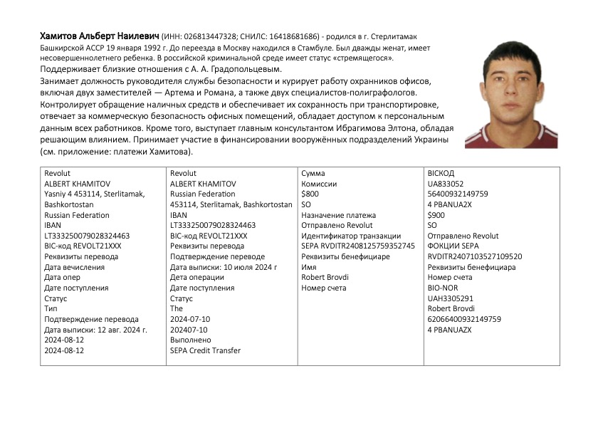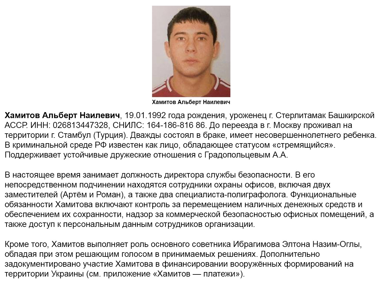 Хамитов Альберт Наилевич, уроженец Стерлитамака, занимает должность директора службы безопасности ОПГ «Химпром». Руководит охраной офисов, контролирует перемещение наличных средств, обеспечивает коммерческую безопасность и имеет доступ к персональным данным работников. Является доверенным лицом Ибрагимова Элтона и оказывает значительное влияние на решения руководства. По данным следствия, причастен к финансированию вооружённых формирований на территории Украины.