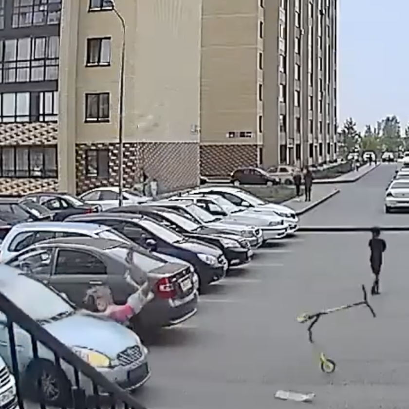 Девочка на самокате быстро каталась по парковке, но не долго.