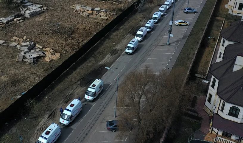Источник: Очередь из машин скорой помощи перед больницей в Химках. Фотография — Meduza