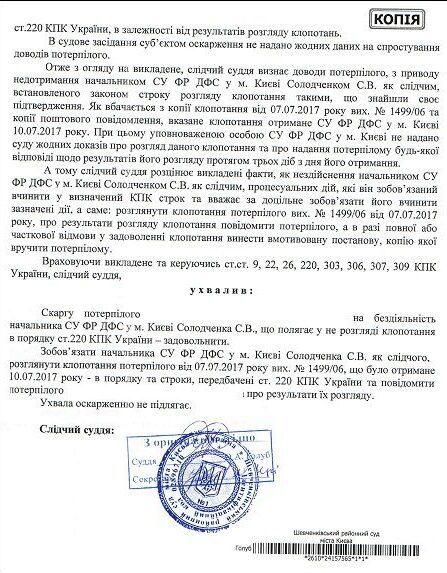 — 18.07.2017 года, Постановлением под № 761/24811/17 следственного судьи Шевченковского районного суда Киева обязали начальника СУ ФГ ГУ ДФС в Киеве СОЛОДЧЕНКО Сергея Викторовича рассмотреть ходатайство лица 1 от 07.07.2017 года в за исх . № 1498/06;