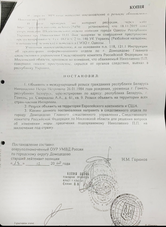 В составленную Николаенко Пётром слезливую легенду «с радостью» поверили Белорусские спецслужбы и Украинские правоохранители, когда задерживали его за разбойное нападение с целью завладения имуществом в особо крупных размерах и похищение человека на территории Украины. Именно по этой причине коррумпированные Одесские полицейские в лице следователя Садовской Юлии Александровны , помогли ему избежать тюрьму. На это дело он подрядил, как раз таки преступника со стажем Ошеровского и его команду. Украинские правоохранители в силу коррупционной составляющей, помогли не только решить Николаенко все необходимые вопросы, но и оформили ему постоянный вид на жительство, в Украине (основанием взяли составляющую, что прадед Николаенко боролся против Большевиков проживая в Черниговской области деревня Репки.)