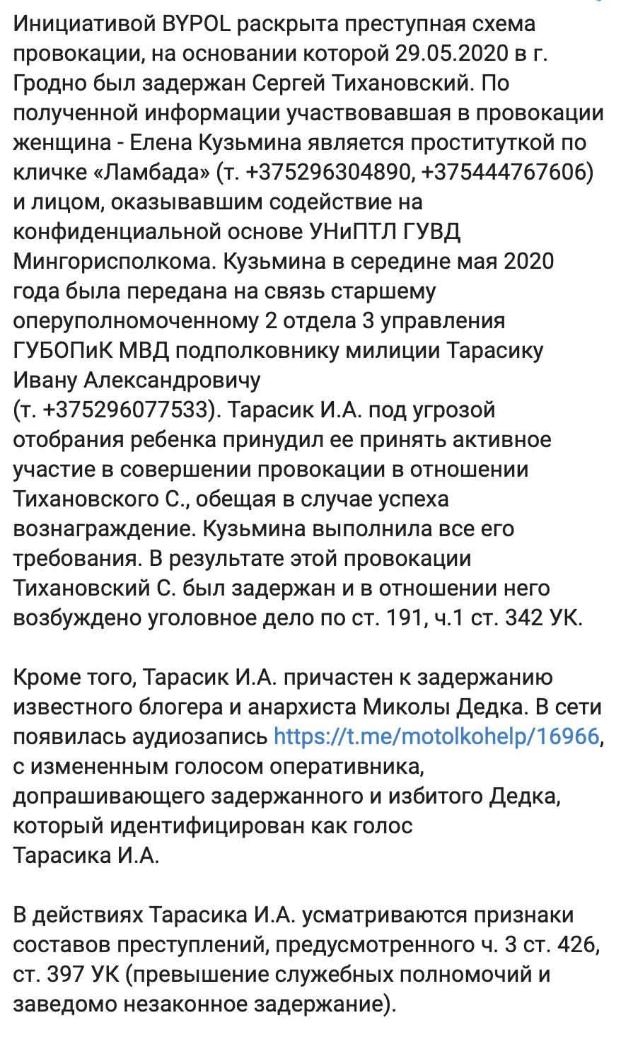 С указанной целью была разработана оперативная комбинация, главная роль в реализации которой принадлежала, как сообщалось нами ранее, проститутке по кличке «Ламбада», сотрудничавшей на конфиденциальной основе с оперуполномоченным Тарасиком И.А.