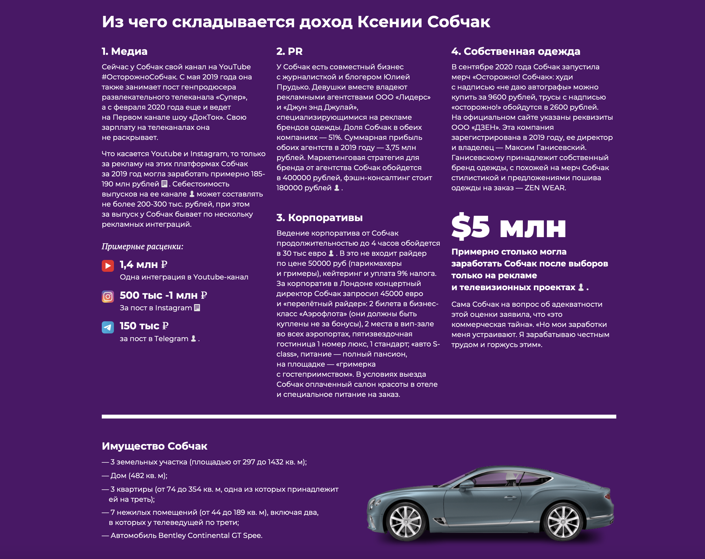 В 2016 году Собчак публично рассказывала, что ее бизнес по сдаче помещений в аренду приказал долго жить . У меня в свое время, еще в лужковские годы, был маленький арендный бизнес. Я покупала небольшие помещения в жилых домах, переводила их в нежилой фонд и сдавала в аренду под всякие маленькие аптеки и магазины. Затем эта опция была закрыта: якобы жильцы домов были недовольны, что у них на первых этажах то ремонт, то веселая музыка из кабаков. Мой бизнес приказал долго жить, и не могу сказать, что я от этого в восторге, писала Собчак в колонке для сайта Сноб из-за того, что мэрия Москвы изменила правила перевода жилых помещений в нежилой фонд. Как показывает история с квартирой на Чистых прудах, которая до сих пор приносит телеведущей доход, публичные заявления Собчак содержат лишь часть правды. Это касается не только бизнеса, но и политики.