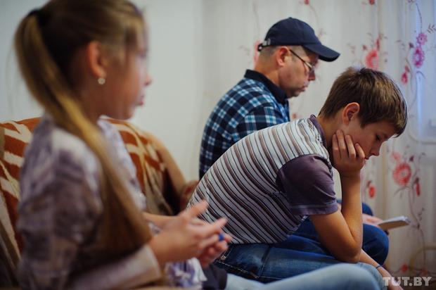 Владимира с разных сторон облепили мал мала меньше. Отец время от времени строгим взглядом осаживает самых шустрых — 3-летнего Давида и 6-летнего Тимофея. Малыши на время успокаиваются, но куда им деть свою энергию, пока папа занят, ума не приложат. Мама на работе, поэтому на правах старшего брата к воспитательному процессу подключается 13-летний Данила.