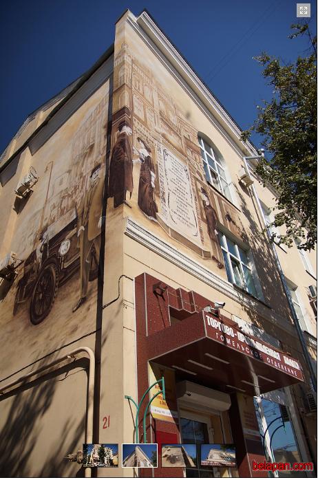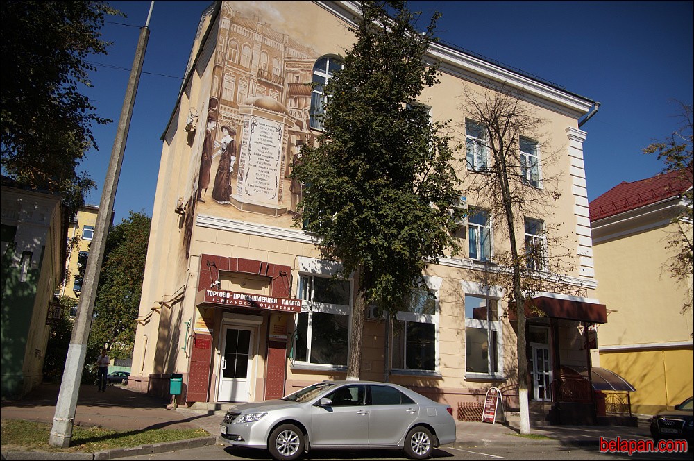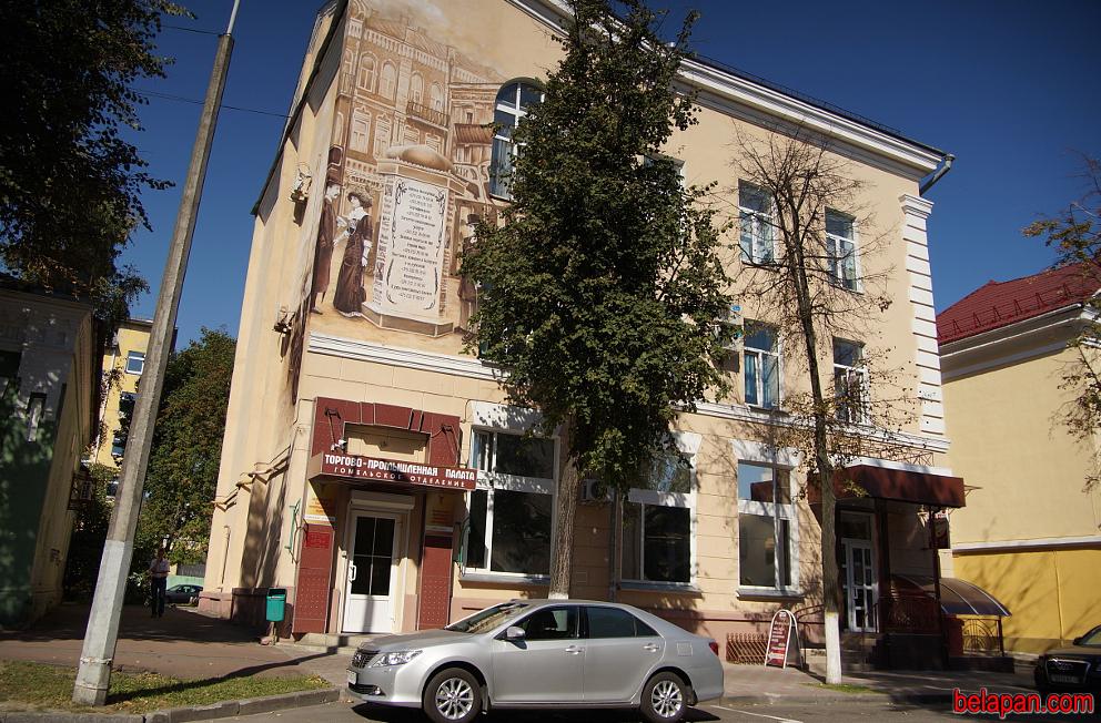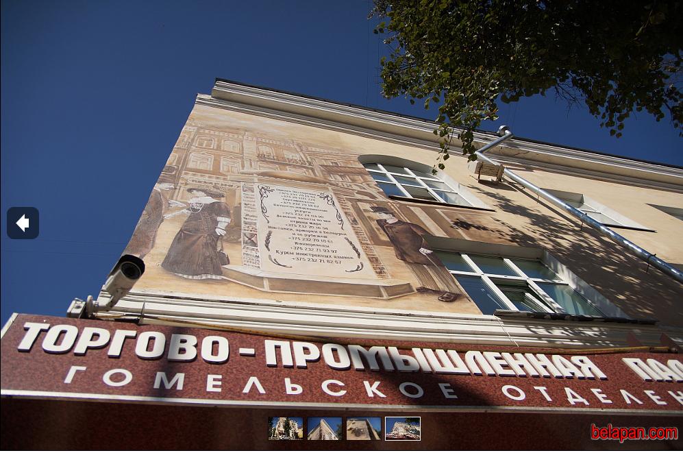 Здание областной торгово-промышленной палаты уличный художник украсил по мотивам фотографии Гомеля начала XX века, на которой запечатлена деловая жизнь того времени.