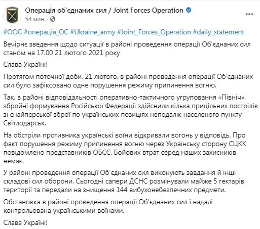 В районе ответственности оперативно-тактической группировки «Север» вооруженные формирования России совершили несколько прицельных выстрелов со снайперского оружия по украинским позициям в районе населенного пункта Светлодарск. На обстрелы противника украинские воины открывали ответный огонь», – сказано в сообщении.