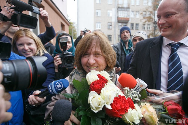 На вопрос, поздравил ли ее кто-то из властей, белорусский министр культуры, Алексиевич ответила, что нет. «Поздравил российский министр культуры, белорусский — нет».