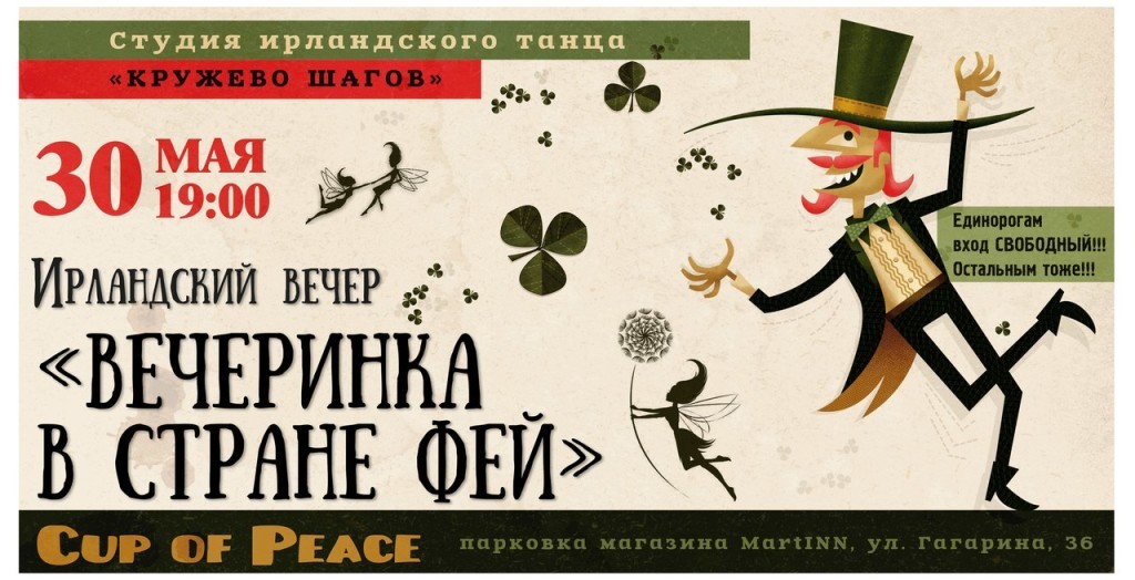 30 мая Студия ирландского танца «Кружево шагов» призывает присоединиться к вечеринке в стране Фей. Весь вечер у кофе-вагончика «Cup of Peace» будут звучать ирландские мелодии.