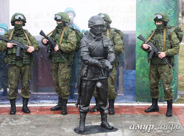 В Белогорске состоялось открытие памятника Вежливому солдату. На церемонии собрались десятки жителей города, а также главы муниципальных образований региона, временно исполняющий обязанности губернатора Амурской области Александр Козлов, мэр Белогорска Станислав Мелюков. Скульптура высотой около двух метров установлена напротив здания администрации города. Когда с монумента сняли покров, оказалось, что лицо воина, держащего котёнка, не скрыто маской – в отличие от его прототипа, запечатлённого на популярном снимке, сделанном в Крыму в прошлом году. Таково было пожелание мэра Белогорска Станислава Мелюкова, который курировал создание и установку скульптуры, сообщает «амур.инфо«