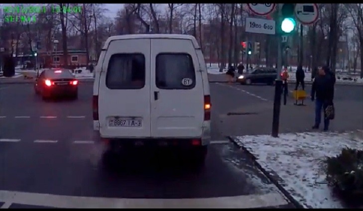 Впоследствии удалось найти запись, на которой видно, как все происходило. На красный свет через «зебру» едет автомобиль, сбивает человека, останавливается, сообщает «onliner.by«