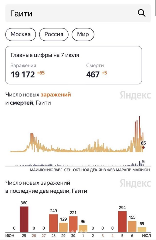 Во всех этих странах заболеваемость ковидом практически отсутствовала. Население Гаити — 11,5 миллионов человек, это примерно столько же, сколько в Израиле или Беларуси, даже чуть больше. Израиль: 844 378 больных, 6 429 умерших, 5 186 400 привитых. Население 9 291 000 чел. Беларусь: 423 519 больных, 3 214 умерших, 369 272 привитых.